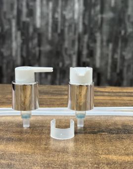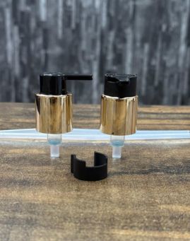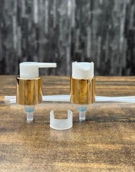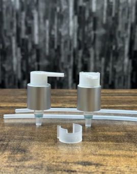 Cosmetic dispenser full over cap, aluminium collar, or all plastic are available.